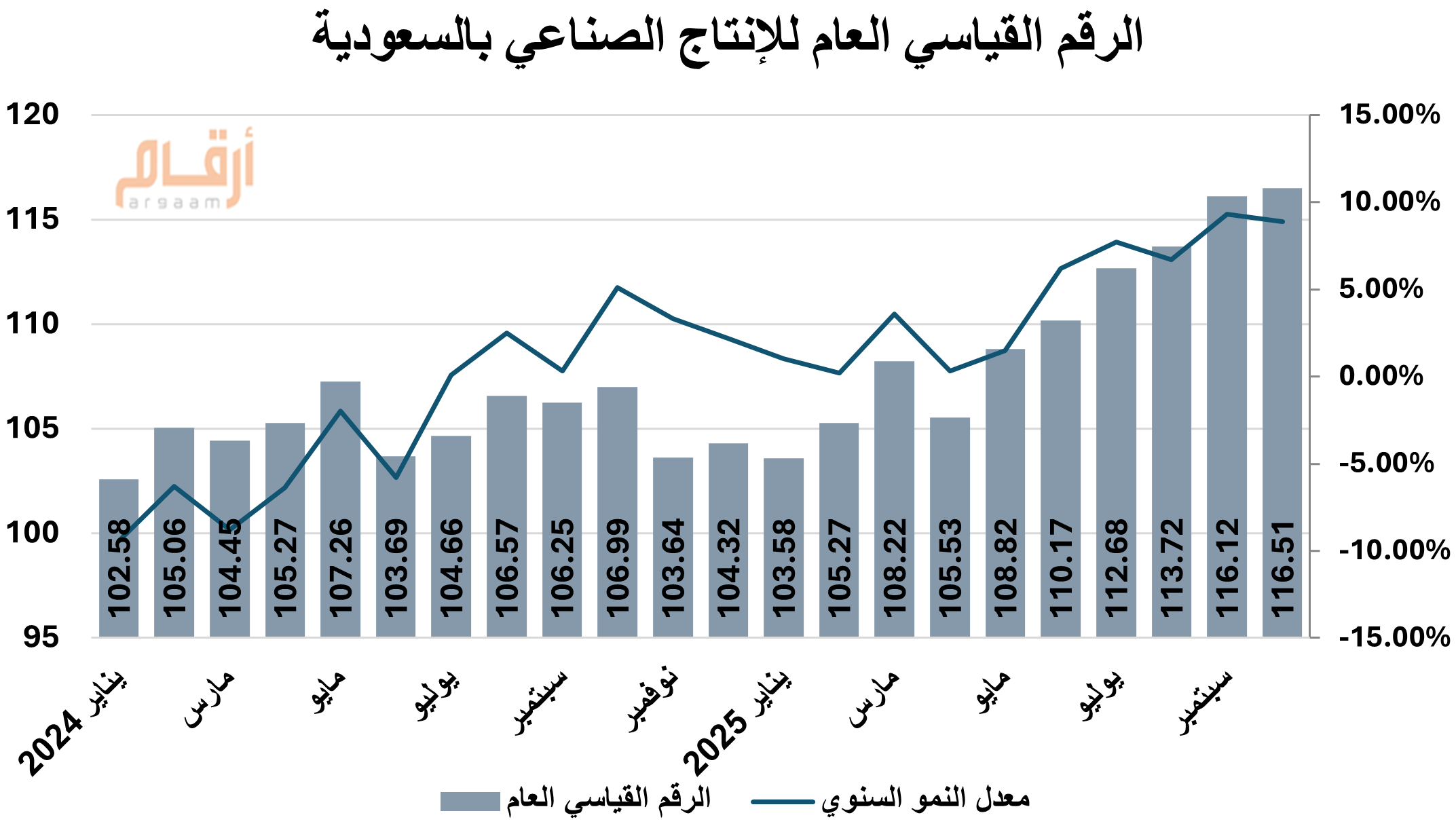 وحسبما أظهرت البيانات الصادرة عن الهيئة العامة للإحصاء، ارتفع الرقم القياسي العام للإنتاج الصناعي إلى 116.51 نقطة خلال شهر أكتوبر وفقًا لسنة الأساس 2021، مقارنةً بـ 106.99 نقطة خلال شهر أكتوبر 2024.