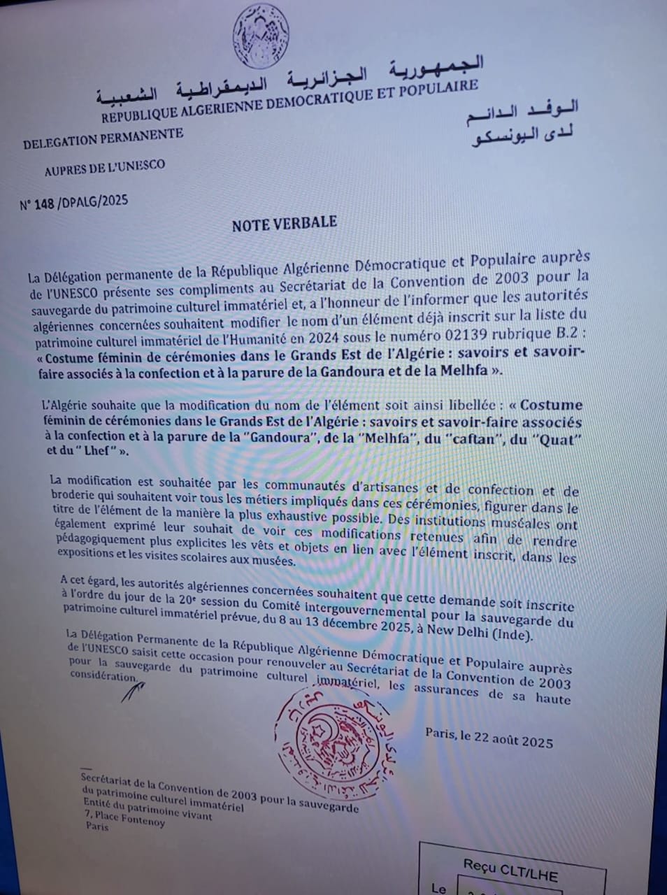 وأشارت الوثيقة التي تحمل رقم 148/DPALG/2025 وتاريخ 22 غشت 2025، إلى أن السلطات الجزائرية المعنية رغبت في تغيير اسم عنصر "الزي النسائي الاحتفالي في شرق الجزائر الكبير: المعارف والمهارات المرتبطة بصناعة وتزيين القندورة والملاحفة"، لتوسيع العنوان ليشمل القندورة، والملاحفة، والقفطان، والجلابة، والقط، واللحيف.