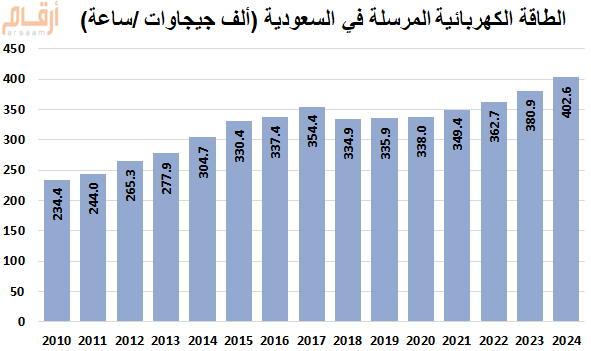 ووفقًا لبيانات الهيئة، بلغ إجمالي الطاقة الكهربائية المرسلة في عام 2024 نحو 402.63 ألف جيجا واط /الساعة، مرتفعا بنسبة 5.7% عن عام 2023.