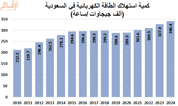 أظهرت بيانات الهيئة العامة للإحصاء، ارتفاع استهلاك الطاقة الكهربائية في المملكة بنحو 4.1% خلال عام 2024، ليصل إلى 340.43 ألف جيجا واط/الساعة، مقارنة بـ 327.00 ألف جيجا واط/ الساعة خلال 2023.