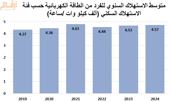 وسجل متوسط الاستهلاك السنوي للفرد من الطاقة الكهربائية حسب فئة الاستهلاك السكني في عام 2024 ارتفاعًا بنسبة 0.9% حيث بلغ 4.57آلاف كيلوواط ساعة/ فرد، مقارنة بنحو 4.53 ألف كيلوواط ساعة/ فردفي عام 2023.