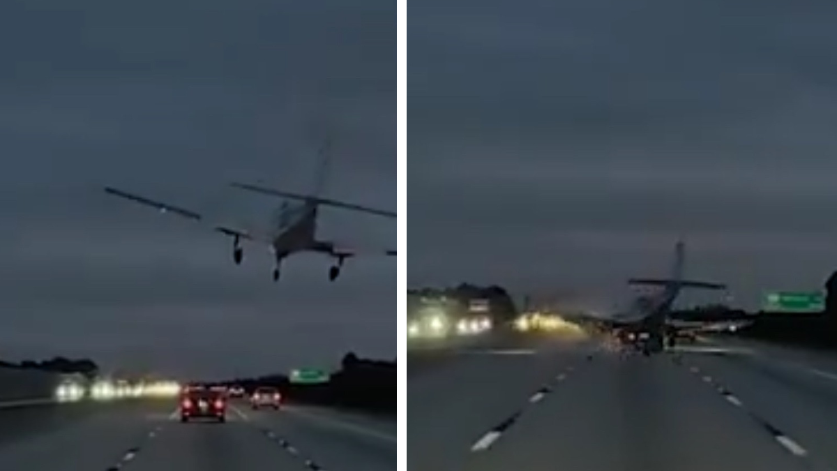 وتظهر لقطات مسجل السيارة الطائرة وهي تهبط اضطراريا على الطريق المزدحم خلال ساعة الذروة، حيث صدمت مؤخرة السيارة ثم ارتدت إلى يسارها محدثة شرارات.